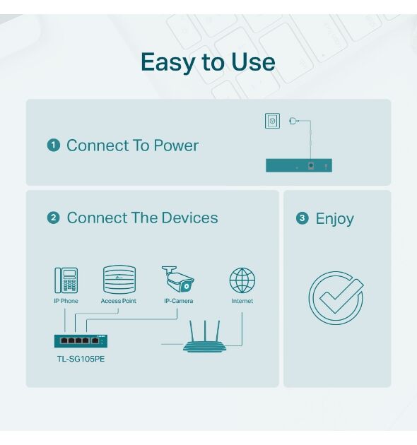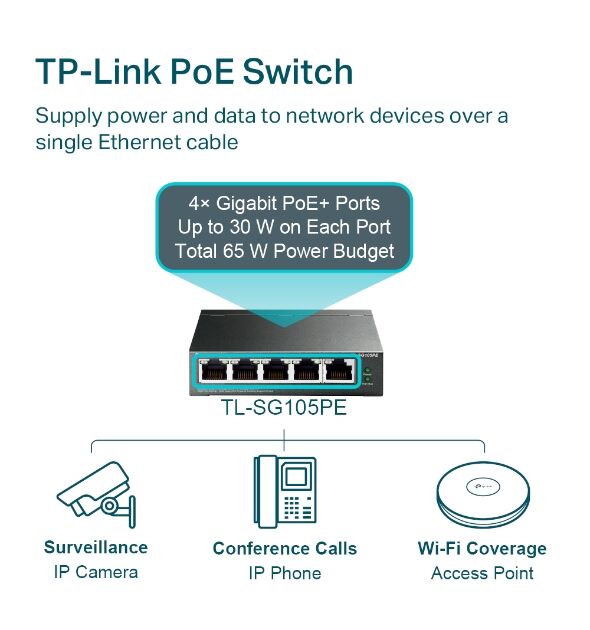 Το TL-SG105PE είναι πλήρως συμβατό με συσκευές PoE, όπως κάμερες IP, σημεία πρόσβασης και τηλέφωνα IP.