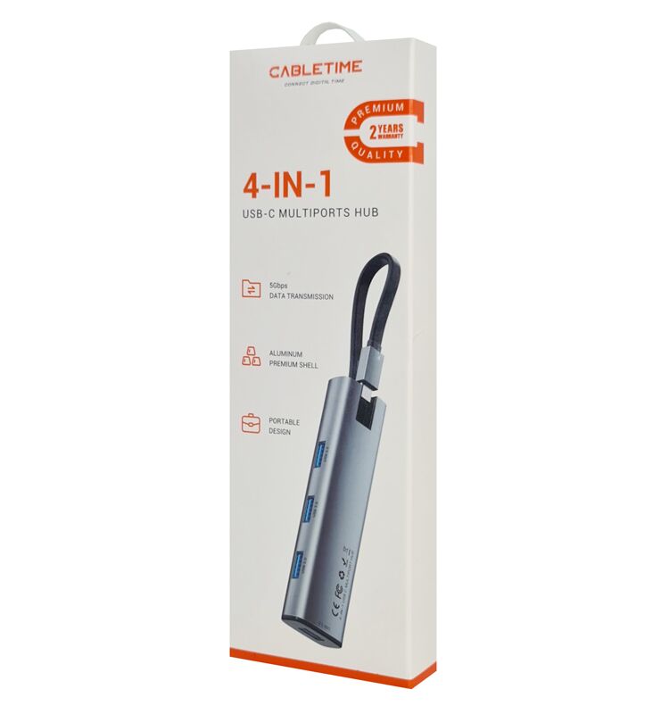 USB Hub CABLETIME CT-HUBP4 4x θυρών 5GBPS με USB-C σύνδεση γκρι
